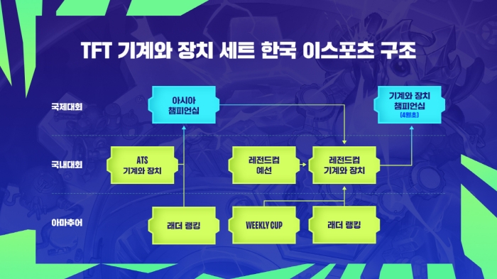 ...22 패치를 통해 출시된 TFT: 기계와 장치 세트는 마법과 기술이 만나 마법공학 증강 효과를 발휘, 게임마다 새로운 전략을 짜게 만든다는 특징을 갖고 있다. TFT의 여섯 번째 세트가 나오면서 라이엇 게임즈는 e스포츠 대회 구조에도 변화를 줬다. 기존에는 지역 대회와 대표 선