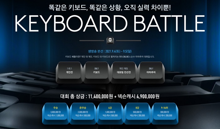 ... 이번 대회 상금은 총 1,140만 원, ‘넥슨캐시’ 490만 원 규모이며, 대회 우승자는 ‘THE KING OF KEYBOARD’ 타이틀과 상금 300만 원, ‘넥슨캐시(100만 원)’, 그리고 로지텍에서 제공