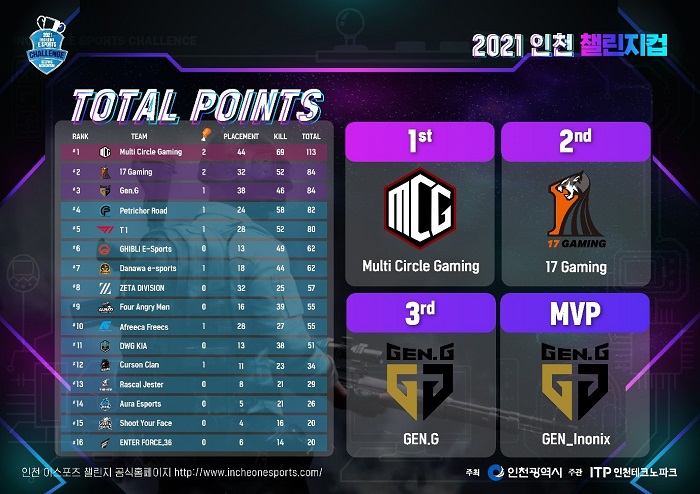 ... 이번 리그는 4인 스쿼드 모드로 1일 5매치씩 양일간 총 10매치를 실시, 무서운 기량을 뽐내며 ‘113’이라는 높은 포인트를 획득한 ‘Multi Circle Gaming(멀티 써클 게이밍)’이 우승의 영광을 차지했다. 또한