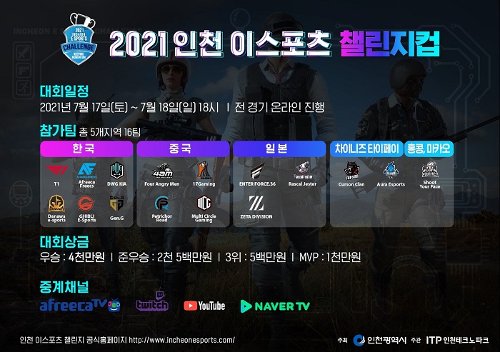 ... 특히 우승을 차지한 1등 팀에게는 상금 4천만 원을 수여하며, 준우승 팀에게는 2천 5백만 원, 3등 팀에게는 1천만 원, MVP에게는 5백만 원 등 총 8천만 원의 상금이 주어진다. 아울러 ‘인천 챌린지 컵’에는 한국 대표로 ▲T1(티원) ▲A