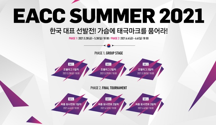 ... 6월 4일부터 6일까지는 각 조 1위 4개팀이 승자연전 방식으로 경기를 진행해 상위 3개 팀이 ‘EACC SUMMER 2021’에 대한민국 대표 자격으로 참가하게 된다. ‘EACC SUMMER 2021 한국 대표 선발전’ 본선 상
