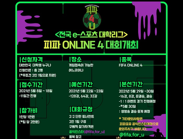 ... 제 1회 피파 4 U 대회는 2대 2 모드로 진행되며, 본선 1일차인 5월 29일에는 2:2 모드 조기탈락자에 한하여 1:1 모드 이벤트 게임도 진행된다. 1위팀에게는 상금 25만 원과 넥슨캐쉬 25만 원, 2위팀에게는 상금 15만 원과 넥슨캐쉬 15만원, 3위팀에게