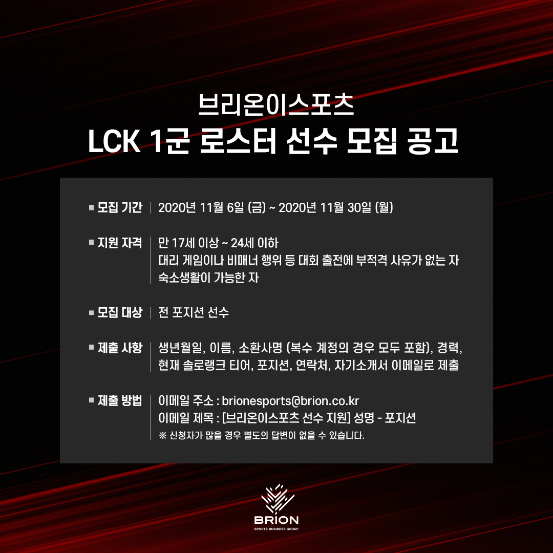 ... 자격 요건이 갖춰졌다면, 아래 필수 내용이 포함된 지원서를 작성해 메일로 접수하면 된다. 자세한 사항은 브리온이스포츠 SNS를 통해서 확인 가능하며, 서류 합격자에 한하여 개별 통보할 예정이다. 이번 공개 모집과 관련하여 브리온이스포츠는 “최우범 감독의