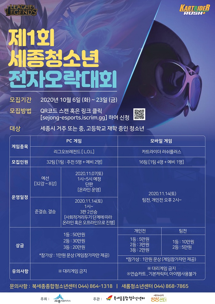... 참가 신청은 10월 6일부터 10월 23일까지 세종청소년 전자오락대회 아이스크림 페이지(https://sejong-esports. iscrim. gg)에서 하면 된다
