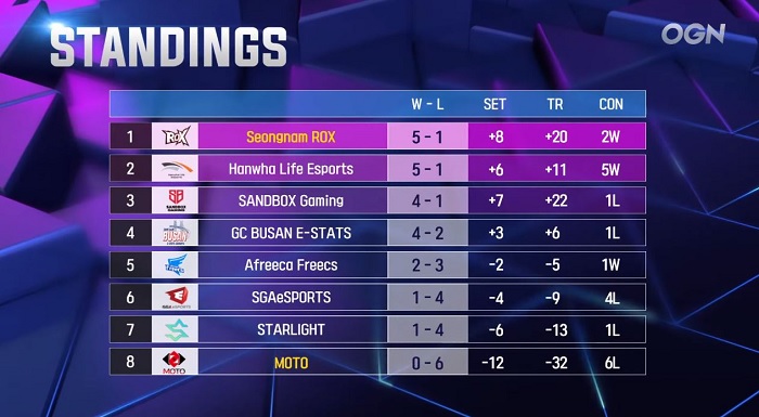 ... 또한, 9월 19일 진행된 8강 풀리그 17경기에서는 GC부산 E-STATS가 에이스 결정전까지 가는 치열한 승부 끝에 SGAe스포츠에 세트 스코어 2대 1로 승리했고, 18경기에서는 스피드전을 가볍게 3대 0으로 승리한 한화생명 e스포츠가 아이템 전에서 선전한 MOTO와의