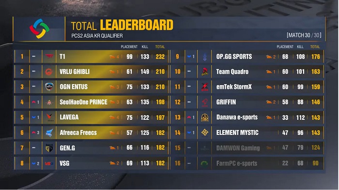... 마지막 날 매치 우승 1회에도 불구하고 고득점을 달성한 VRLU GHIBLI(브이알루 기블리)는 149킬 210포인트로 2위에 올랐다. 133킬 210포인트로 3위를 차지한 OGN ENTUS(OGN 엔투스)는 PCS 채리티 쇼다운부터 PCS2까지 올해 세 번의 PCS에 모