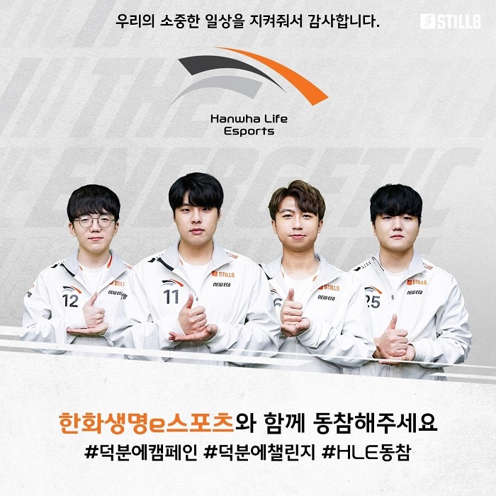 ... 또한 ‘덕분에’ 챌린지를 보다 확산시키고 좋은 취지를 팬들과 나누고자 오는 20일까지 한화생명e스포츠 공식 페이스북에서 이벤트를 실시한다. 참여 방법은 이벤트 게시글과 본인 SNS에 ‘존경합니다’를 뜻하는 수어 동작의 사진을 찍어