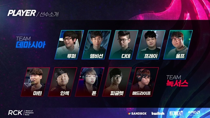 ... 첫 경기는 레전드 선수들이 은퇴하기 전 가장 멋진 활약을 선보였던 상징적인 챔피언으로 경기를 진행하는 시그니쳐 픽으로 경기를 진행했는데 3개의 선택지가 모두고정되어 강제로 리 신을 플레이한 인섹(최인석) 외에도 매드라이프(홍민기)의 블리츠크랭크, 다데(배어진)의야스오, 마린(장경