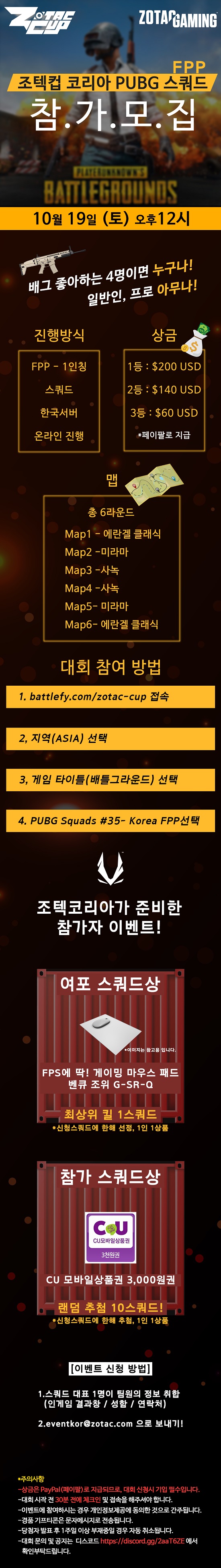 ... 토너먼트 진행 및 신청은 Battlefy에서 주관하며, 4명으로 구성된 스쿼드면 일반인도 누구나 지원 가능하다. 단, 경기 시작 최소 30분 전에는 Battlefy 로그인 및 체크인이 되어 있어야 하며, 조텍컵 공식 디스코드 채널을 통해 경기 안내를 받아야 한다.