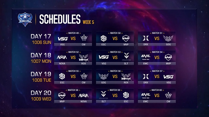 ... 연패 중이었던 MVP가 DragonX Busan(GC Busan) (이하 DRX)와의 경기에서 승리하면서 이번 시즌 첫 승리를 기록했다. DRX는 이후 CW와 SLT의 대결에서도 연이어 패배하면서 10위까지 순위가 내려갔다. 반면, 연패의 아픔을 겪고 있던 VSG가 MVP와의