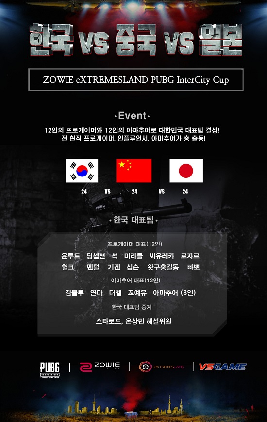 ... 한국대표팀은 김블루, 윤루트, 연다, 딩셉션, 석TV, 미라클, 더헬, 왓구홍길동, 로자르, 헐크, 멘털, 씨유레카, 기켄, 심슨, 빠뽀, 꼬예유와 일반인 실력자 8명으로 구성되었으며, 서울 강남구 VSG아레나에서 모여 경기를 진행할 예정이다. EL 펍지 인터시티컵은 온상민 해