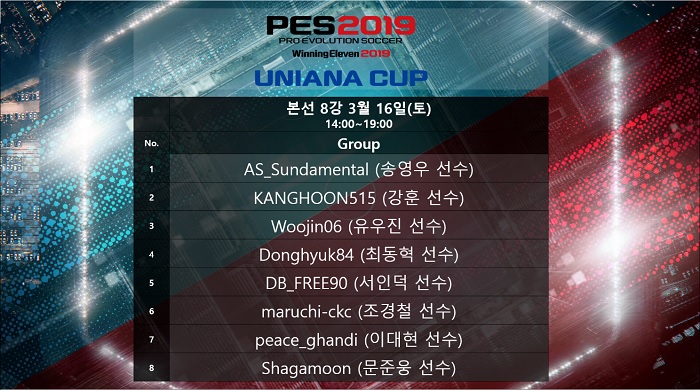 ... UNIANA CUP 본선 8강은 2019년 3월 16일(토) 오후 1시부터 개최 예정되며, 본선 8강 종료 후 PES(위닝일레븐)을 좋아하는 분들은 누구나 즐길 수 있는 ‘위닝인의 밤’을 진행할 예정이다. [게임조선 편집국 gamedesk@chosun. com] [g