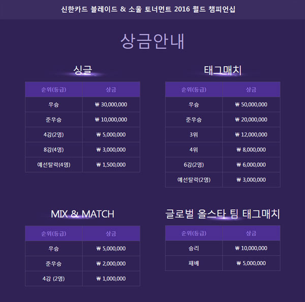 ... 나머지 한국 2명, 일본 2명, 대만 1명이 듀얼 토너먼트(승자군 패자군이 각각 경기로 승패를 정하는 방식)로 대결을 펼친다. 각 조 1, 2위 4명이 결선에 진출한다. 태그매치 본선은 한국 2팀, 중국 2팀, 일본 1팀, 대만 1팀이 대결을 펼쳐 총 3개팀이 결선에 오른다