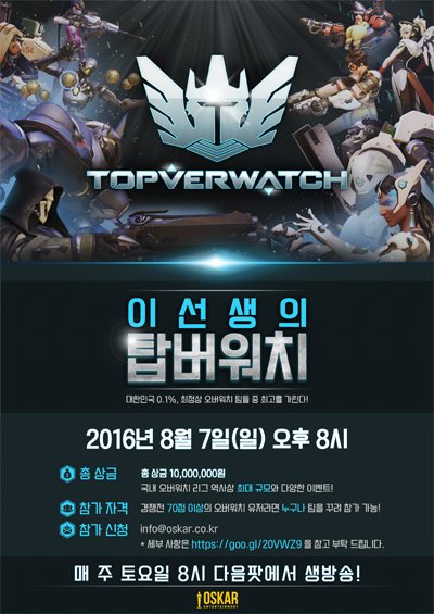 ... '대한민국 0. 1% 오버워치 최고 플레이어를 가린다'는 슬로건으로 진행되는 이번 대회는 경쟁전 점수 70점 이상의 고랭크 유저만 참가할 수 있으며 대회는 매주 토요일 오후 8시 8강 토너먼트로 진행된다. 대회 해설에는 오스카엔터테인먼트 소속 다음tv팟 인기 BJ '이선생