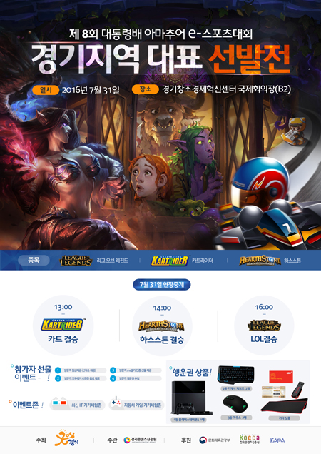 ... 단, '리그오브레전드'는 2015~2016 시즌 LoL챔피언스코리아, LoL챌린저스코리아 대회 참가 경력자는 참가할 수 없다. 이번 경기지역 본선 1, 2위(리그오브레전드는 1위)에게는 소정의 상금이 지급되며 경기도 대표로 전국결선에 출전하게 된다. ‘제8회 대통령배 아마