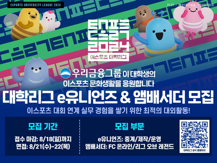 ... 이들은 9월 7일(토)부터 11월 24일(일)까지 약 3개월간 대학리그 중계 및 콘텐츠 출연, 방송제작, 대회 기획 및 운영 등에 참여하며, 부문별로 전문가들의 지도를 받아 이스포츠 실무 경험을 쌓게 된다. 활동을 무사히 마친 e유니언즈에게는 수료증이 수여되며, 우수 수료생의
