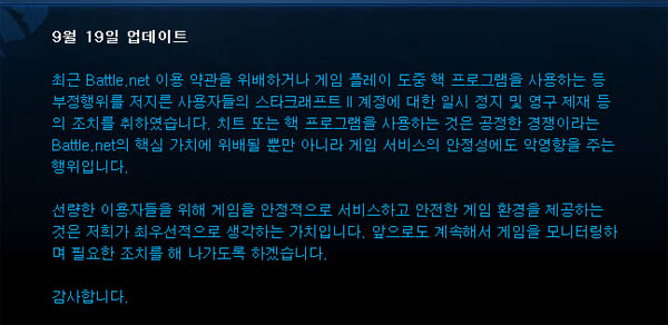 ... 현재 스타2는 맵핵-드롭핵 등으로 몸살을 앓고 있다. 스타2 관련 커뮤니티를 돌아보면 맵핵 의심 유저들의 아이디를 지목하며 성토하는 글들을 쉽게 찾아 볼 수 있다. 블리자드 역시 이에 대한 대응으로 꾸준히 부정행위 유저들을 제지하고 있으나 큰 효과를 거두지는 못했다