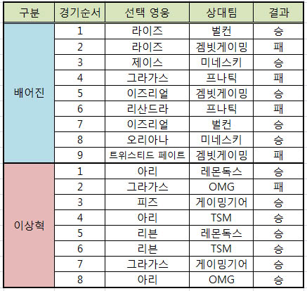 ... 이상혁은 팬들의 기대 이상으로 활약을 하며 대세로 떠오른 반면 배어진은 기대 이하로 팬들의 비난에 직면해 있다. 특히 배어진은 여러 차례 기회가 있었음에도 팀 승리에 크게 기여하지 못하며 8강 탈락의 원흉으로 지목되고 있다. 이들 두 명의 챔피언 선택을 살펴보면 더욱 비교하