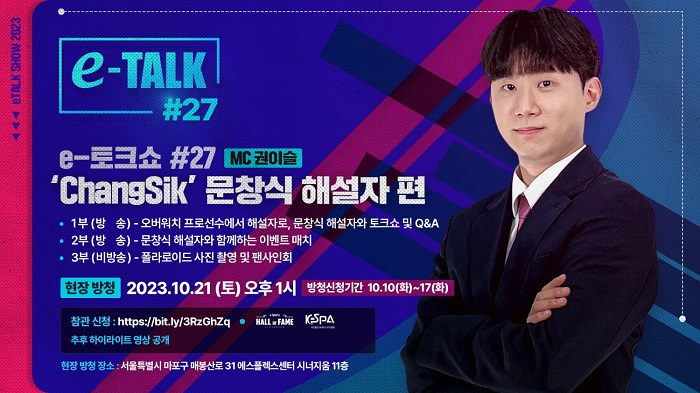 ... 실제로 전·현직 프로 선수, 종목사 관계자, 기자, 해설자, 방송 PD, 후원사 등 다양한 업계 전문가들이 연사로 참여해 행사를 빛내고 있다. 오는 21일(토) 오후 1시에 열리는 27회 ‘e-토크쇼’에는 오버워치 전 프로 선수이자 현재