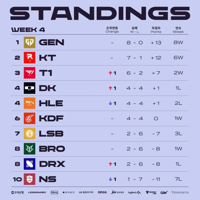 ... 4주 차에서 중하위권 팀들인 OK저축은행 브리온과 한화생명e스포츠를 상대한 젠지는 후반에 힘을 발휘하는-소위 '고밸류'라고 불리는-챔피언 조합으로 경기를 펼치면서도 강력한 힘을 발휘하는 타이밍을 앞당기면서 두 경기 모두 2대0으로 승리했다. OK저축은행 브리