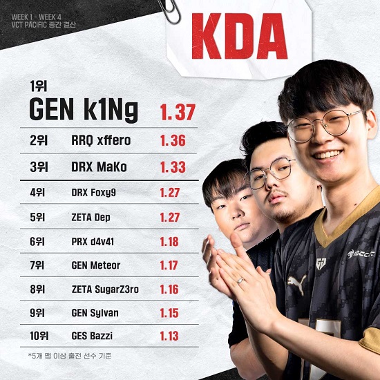 ... 압도적인 행보를 보이고 있는 DRX는 말레이시아/싱가포르 팀인 페이퍼 렉스(Paper Rex; PRX)와의 경기를 세트 패배 없이 승리하면서 4경기 연속 무실 세트 전승 행진을 이어갔다. T1은 젠지에 패배하면서 6위로 떨어졌다. ◆ 단 10개 라운드만 내준 젠지의
