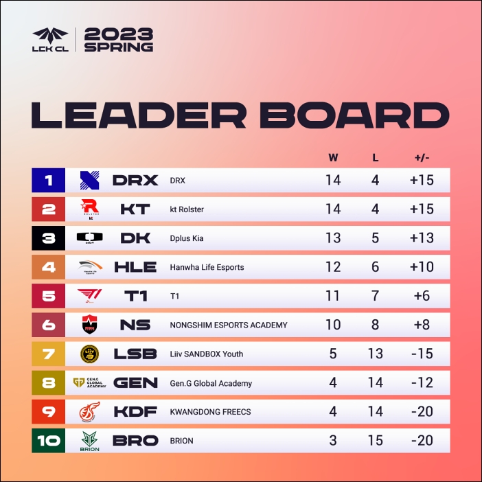 ... DRX는 매치 10연승의 ‘미라클런’으로 정규 시즌 최종 성적이 14승 4패로 +15로 kt 롤스터와 동일하지만, 상대 전적 우위로 1위를 달성했다. 다음으로는 디플러스 기아가 13승 5패로 3위, 한화생명e스포츠가 12승 6패로 4위를 기록했으며, T1이