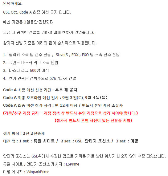 ... 해당 내용에 따르면 9월 3일과 4일 양일 간진행되는 GSL 2011 시즌6 예선은 스타크래프트2(이하 스타2) 협의회 소속 선수 전원과 슬레이어스, 폭스, FXO(구 : fOu) 소속 선수가 우선 참여 자격을 얻으며 마스터 리그 600점 이상 유저까지 참가 가능하다. 또한선