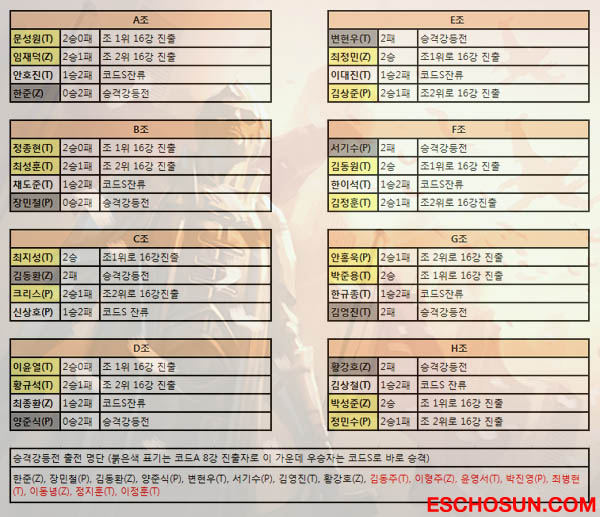 ... 코드A에선 다시 한 번 도약하고 있는 '해병왕' 이정훈(프라임)을 비롯해 김동주(슬레이어스), 이형주(프라임), 윤영서(슬레이어스), 박진영(TSL), 최병현(IM), 이동녕(FXO), 정지훈(NS호서) 등 8강 진출자들이 승격강등전 진출권을 획득했다. 단, 진행중인 코드A의