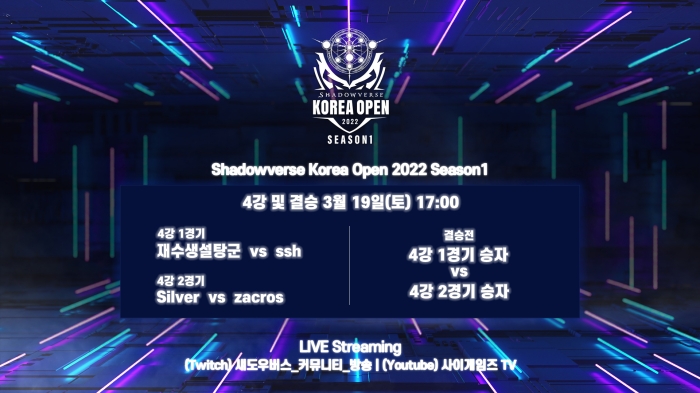 ... 더불어 연말 진행 예정인 ‘섀도우버스 코리아 오픈 2022 그랜드 파이널’의 첫 번째 초청자 타이틀을 두고, 어느 때보다 치열한 경기가 펼쳐질 전망이다. 지난 12, 13일 진행된 8강 경기에서는 섀도우버스 코리아 오픈 2021 시즌 1 우승자인
