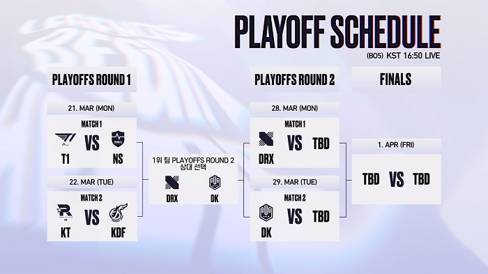 ... 개막 이후 한 번도 패하지 않으며 16연승을 이어간 T1은 1위를 확정 지었고 13승 3패를 달성한 젠지는 2위를 차지하면서 T1과 함께 6강 플레이오프 2라운드 직행 티켓을 손에 넣었다. 하위권에서는 4승 12패의 농심 레드포스와 리브 샌드박스, 3승 13패의 한화생명e스포츠