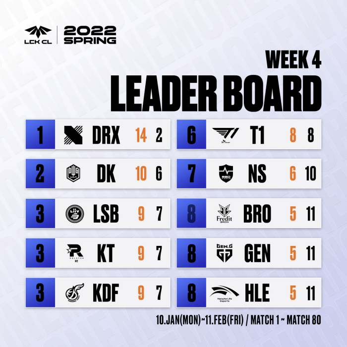... DRX는 챌린저스 리그 로스터 선수 중 4명이 긴급 콜업되어 9일(수) LCK 경기를 소화했음에도 이번주에 3승 1패를 추가해 14승 2패로 여전히 단독 선두를 유지하고 있다. 아울러 이번주 LCK와 LCK 챌린저스 리그 간 긴급 콜업이 다수 발생되어 젠지 이스포츠는 &l