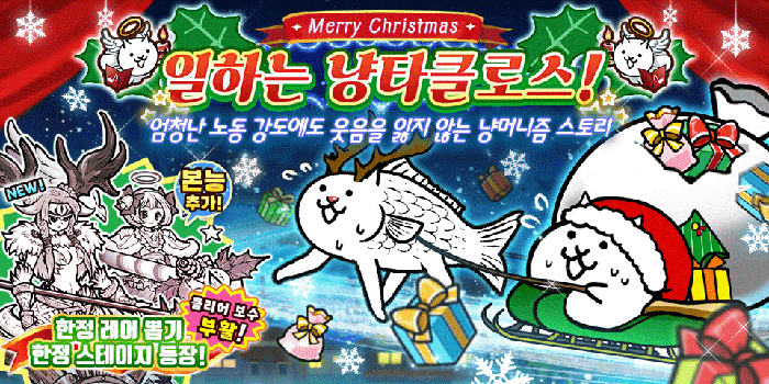 ... 크리스마스 이벤트 기간 한정으로 다양한 스테이지가 개최된다. ‘첫번째 밤: 일하는 냥타클로스’는 클리어하면 이벤트 기간 중에만 얻을 수 있는 캐릭터 ‘고양이의 선물’을 극히 드문 확률로 획득할 수 있다. ‘두번째