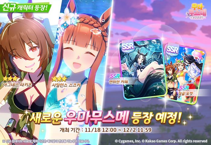 ... 12월 2일까지 진행하는 스토리 이벤트 ‘여름의 햇살은, 푸르고 잔잔하게’에서는 새로운 한정 스토리와 보상을 제공한다. 이용자들은 우마무스메를 육성해 이벤트 포인트와 룰렛 코인을 획득하고, 이벤트 한정 ‘SSR [Seaside Bloom]