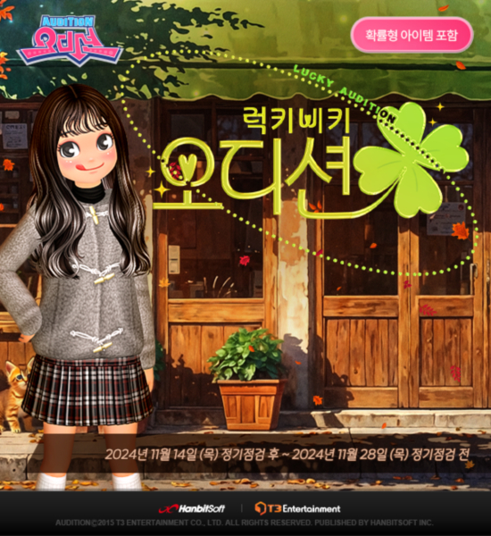 ... 11월14일 점검 후부터 11월21일 점검 전까지는 헤어·페이스·세트류 아바타를, 11월21일 점검 후부터 11월28일 점검 전까지는 상의·하의·신발류 아바타를 각각 할인한다. 또한, 오디션은 이벤트 기간 동안 신상 아바타