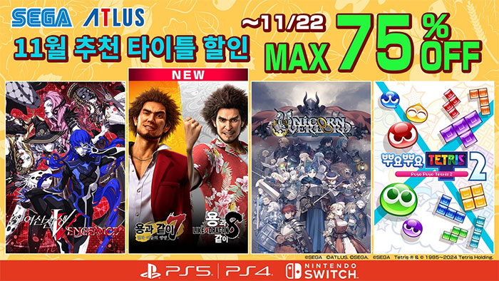 ... 그 외에도 세계적인 인기 액션 퍼즐 게임 '뿌요뿌요™'와 '테트리스®'가 합쳐져 대결을 펼치는 '뿌요뿌요™테트리스®2'도 특가로 판매된다. 할인 대상 타이틀 및 할인율은 특설 웹사이트를 통