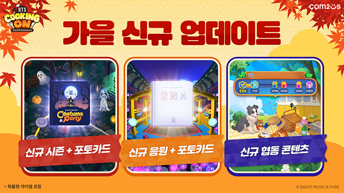 ... 이와 함께 신규 가을 시즌 포토카드 40장도 함께 만나볼 수 있다. 이와 함께 도전용 스테이지인 ‘셰프 챌린지’의 신규 테마도 업데이트됐다. 주요 테마는 발리의 전통 음식인 ‘나시짬뿌르’이며, 이와 곁들여 먹을 수 있는 발리식