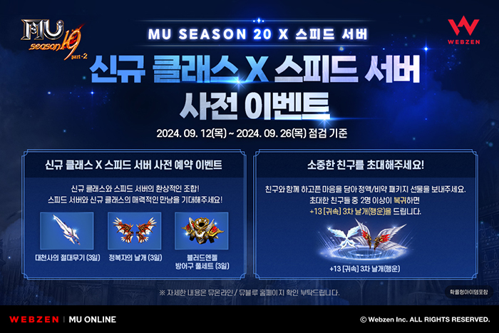 ... 사전 예약을 진행하면 스피드 서버에서 3일간 사용할 수 있는 고급 아이템 ‘대천사의 절대 무기’, ‘정복자의 날개’, ‘블러드엔젤 방어구 풀세트’를 획득할 수 있다. 같은 기간 ‘친구야 함께 날자