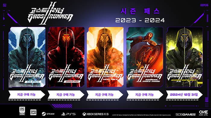 ... 고스트러너 2 시즌 패스를 구매하면 이미 출시된 아이스 팩, 드래곤 팩, 핫 팩, 곧 출시될 1주년 기념 팩을 포함한 4가지 꾸미기 DLC 팩과 많은 기대를 모으고 있는 무한 모토 모드를 모두 저렴하게 이용할 수 있다. 고스트러너 2는 플레이스테이션 5, 엑스박스 시