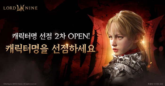 ... 게임의 예비 이용자는 신규 월드 ‘엘드리히’와 ‘아퀼라’ 내 서버에서 캐릭터명을 선점할 수 있다. 로드나인 2차 캐릭터명 선점 이벤트는 공식 홈페이지에서 참여 가능하다. 한편, 스마일게이트는 게임의 출시를 앞두고 이용자를 위한