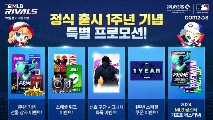 ... 특히 컴투스는 1주년에 대한 감사의 마음을 담아 선호 구단의 원하는 선수를 영입할 수 있는 특별 이벤트를 실시한다. 리그 모드, 랭킹 슬러거 등 주어진 미션을 수행하면 선호 구단의 타자 6명과 투수 4명 등 총 10명의 시그니처 등급 선수 카드 중 하나를 획득할 수 있으며