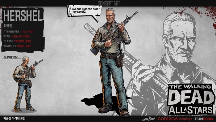 ... 게임에서도 원작의 특징을 반영해 M16A2 소총을 주무기로 사용하며, 수의학 지식으로 자신과 아군의 체력을 회복시키는 다재다능한 능력을 지녔다. 허셜의 스킬은 ‘미지의 생존자’ 콘텐츠에서 체험해볼 수 있다. 업데이트를 기념해 다양한 이벤트가 열린다