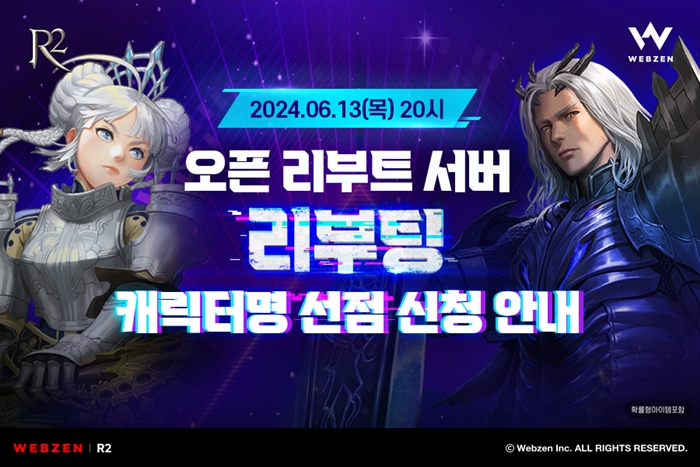 ... 어제(13일) 저녁부터 오는 17일 자정까지 약 나흘간 오픈 리부트 서버 리부팅을 기념한 캐릭터명 사전 신청 이벤트를 진행한다. 게임 이용자는 이벤트 기간에 ‘R2’ 계정에 로그인 후 안내 페이지의 ‘캐릭터명 선점하기’를 통해 계
