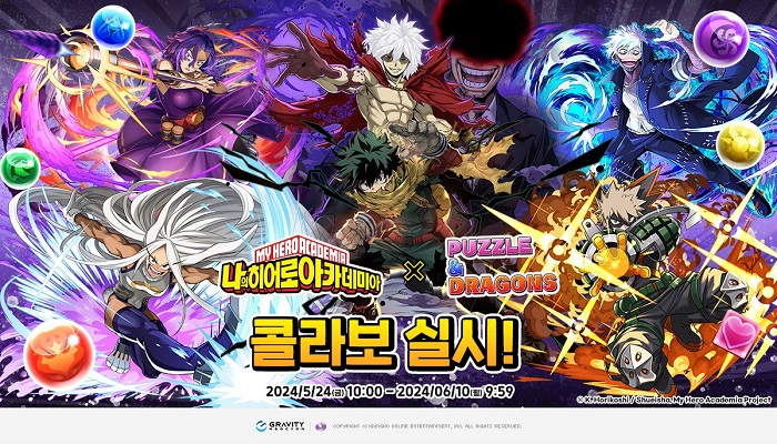 ... 콜라보레이션 이벤트에서는 ‘마법석6개! 나의 히어로 아카데미아 에그’가 등장하며, 신규 캐릭터 ‘데쿠&올마이트’, ‘초현실 해방 전선 시가라키 토무라’ 등을 포함한 콜라보 캐릭터 31종을 만나볼 수 있다