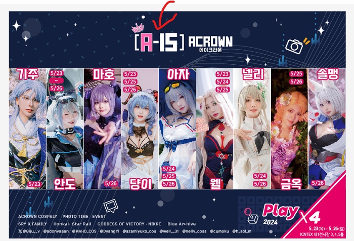 ... 코스프레팀 에이크라운은 다양한 축제와 행사에서 활동하고 있으며, 국내에서 기부와 문화에 다양한 기여를 하고 있다. 한편, 23일부터 26일까지 일산 킨텍스 제1전시장에서 진행되는 플레이엑스포는 국내외 게임사 신작 전시 및 체험이 이뤄지며, 레트로 장터, E스포츠 대회