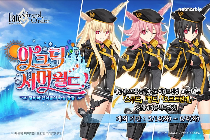 ... 이벤트 메인 퀘스트를 완료하면 스토리에 등장한 '★4(SR)스루드', '★4(SR)힐드', '★4(SR)오르트린데' 중 1기를 선택할 수 있고, 선택한 서번트 1기와 세트인 ‘영의’(일종의 의상 아이템)를 획득