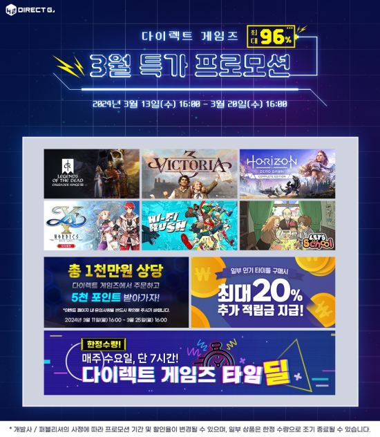 ... 그 밖에도 3월 25일(월) 오후 4시까지 다이렉트 게임즈에서 5천원 이상 타이틀을 구매하는 경우, 추첨을 통해 다이렉트 게임즈 포인트(5,000원)을 받을 수 있는 실시간 포인트 추첨 이벤트와, 3월 특가 프로모션 기간 중 일부 인기 타이틀 구매 시 최대 20% 추가 적립