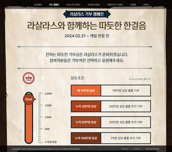 ... 지난달 21일에 사전예약을 시작한 신작 MMORPG ‘라살라스’는 이벤트 중 하나로, 본인 인증한 유저들이 기부처를 선택하면 참여 유저 10만명 당 1천만원의 기부물품을 아이톡시가 직접 구매해 기부하고 있다. 기부처를 투표한 유저들 중 추첨을 통해 여