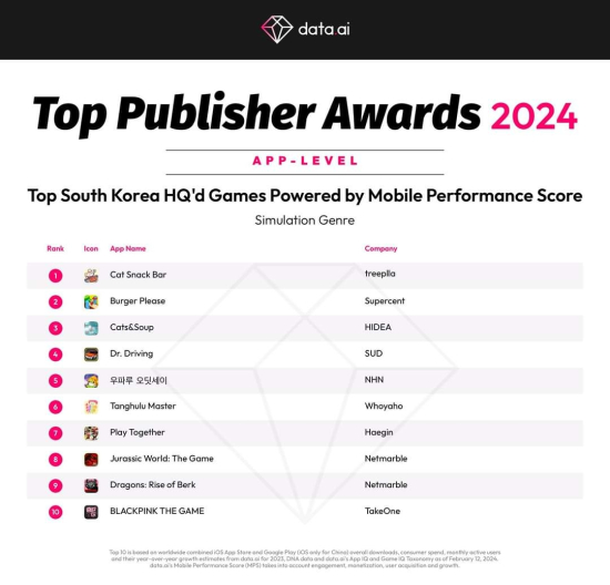 ... 특히 이번 어워드는 다운로드, 수익, 참여도, 성장률 등 총 모바일 성과를 기준으로 수상 게임을 선정했다. 고양이스낵바는 2023년 1월 글로벌 출시돼 서비스 1년만에 글로벌 누적 다운로드 수 3천만 회를 돌파한 인기 게임이다. 개발사 트리플라는 고양이스낵바의 선전으로