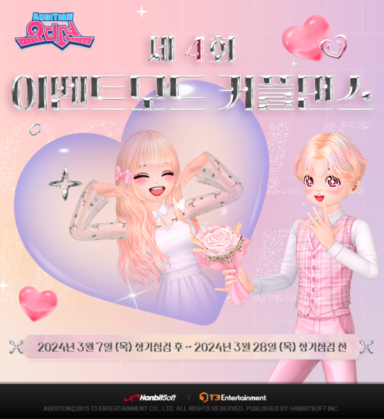 ... 또한 이벤트모드 커플댄스에서 이벤트 코인을 모아 화이트데이 한정판 손 액세서리(무기한), 헤어(무기한), 세트아바타(무기한) 등으로 확정 교환할 수 있다. 이벤트모드 커플댄스 플레이에 필요한 티켓은 매일 5장씩 자동으로 보충되며 추가 티켓은 이벤트모드 팝업창 또는 게임룸에