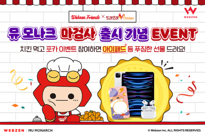 ... 쿠폰에는 '뮤모나크최고닭' 한정 칭호, 보석 아이템 4종, 뮤코인 등 총 아이템 6종이 들어있다. 단, 해당 이벤트 쿠폰은 오는 5월 31일까지 캐릭터당 1회만 사용할 수 있다. 웹젠은 같은 기간 '웹젠 프렌즈 포카 이벤트'도 진행한다
